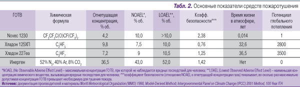 К числу важнейших параметров, влияющих на выбор ГОТВ для защиты помещений дата-центров, относят огнетушащую концентрацию и безопасность для человека и окружающей среды. Для сравнения этих показателей можно опираться на данные табл. 2. Отметим, что все приведенные в ней вещества имеют нулевой озоноразрушающий потенциал.