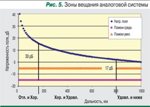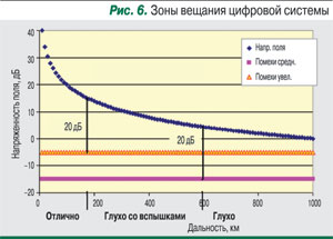 Вторая часть проблемы – собственно планирование сети. Рассмотрим лишь один аспект. В аналоговой сети при наличии внешних помех, уровень которых может иметь случайные изменения, вся зона вещания может быть условно поделена (по радиусу) на три части (рис. 5). Полезной зоной при планировании аналоговой сети считается все, что находится от передатчика до границы, определяемой отношением С/Ш = 30 дБ (в нашем примере – около 160 км). При этом случайные изменения уровня шума (или мешающего сигнала) не принимаются в расчет в силу особенностей аналоговой системы.