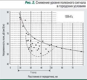 Высокий уровень помех в больших городах даже для аналогового вещания требует повышения напряженности поля практически на 10–20 дБ. Вместе с тем в городе почти всегда повышено и поглощение сигнала, что значительно ухудшает условия приема. Так, в Москве в зонах городской застройки снижение полезного сигнала на СВ-частотах может достигать 12–15 дБ6 (рис. 2). Совокупное влияние повышенного уровня помех и повышенного поглощения приводит к необходимости существенного увеличения уровня полезного сигнала: примерно на 20–22 дБ для компенсации промышленных помех и на 12 дБ – на дополнительное затухание сигнала7. Для сравнения: в соответствии с Рек. BS.1615, для тихих загородных территорий в стационарных условиях достаточен сигнал с уровнем 33 дБ (при модуляции 16 QAM) или 43 дБ (при 64 QAM). Такие места существуют, хотя в Европе они очень редки. Можно ожидать, что в центральной России, в Сибири уровень атмосферных помех ниже, и подобные территории будут встречаться. Помехи также снижаются в зимний период. Но в городе в целом вместе с дополнительными поправками минимальная напряженность поля, особенно при мобильном приеме, по зарубежным данным3, может достигать 75–80 дБ. При этом стандартное отклонение сигнала в городе доходит до 6–8 дБ (Рек. Р.1321-2, п. 4.2).