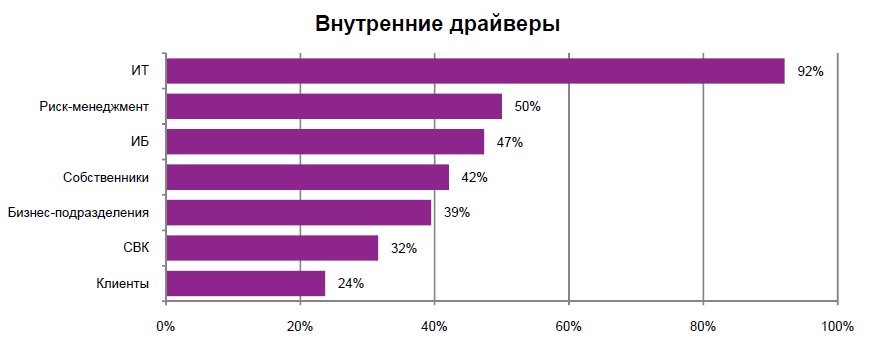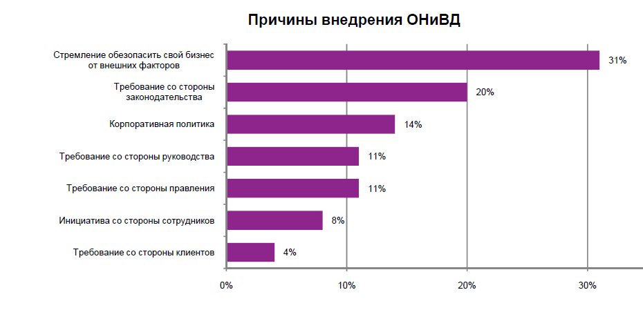 Основной причиной внедрения ОНиВД респонденты назвали внутреннюю потребность в обеспечении безопасности бизнеса от влияния внешних факторов (31%). Среди внешних причин наиболее часто упоминались требование со стороны законодательства (20%) и корпоративная политика (14%).