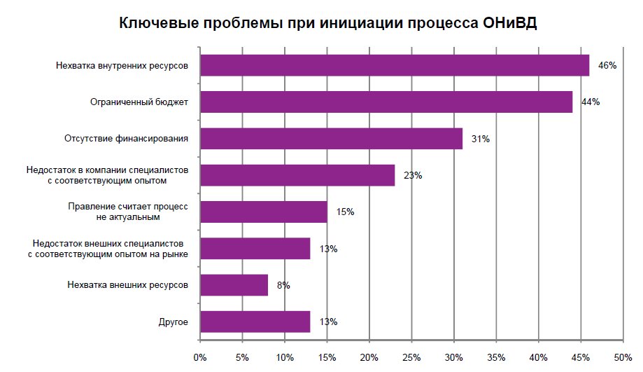 При реализации ОНиВД на первый план выходят организационные проблемы: недостаток внутренних ресурсов и отсутствие нормативных документов, корпоративных шаблонов и форм, а также ошибки при планировании бюджета. Также сюда можно включить низкий уровень координации при взаимодействии с бизнес-подразделениями. Указанные проблемы характерны для компаний, процессы ОНиВД в которых находятся на стадии становления, а стратегия ОНиВД внедрена не полностью.