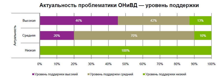 Среди компаний, признающих высокую актуальность проблем ОНиВД, менее половины (46%) пользуются высоким уровнем поддержки в этом вопросе со стороны правления. Это может говорить о том, что правление недостаточно информировано.
