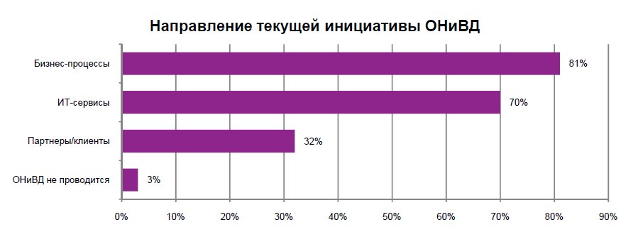 Опрос респондентов показал, что лишь в 22% случаев процессы ОНиВД реализованы полностью. Треть компаний частично реализовала свою стратегию, оставшиеся 45% находятся либо на этапе ее формирования, либо вообще не проводят работу в области ОНиВД.