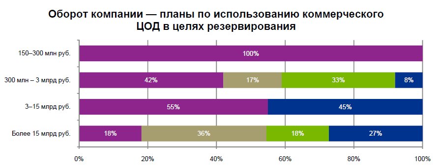 В отношении ОНиВД для большинства компаний актуален вопрос коммерческого дата-центра: 42% респондентов отметили, что имеют собственный дата-центр, но в ближайшее время планируют использовать коммерческий в целях резервирования; 34% компаний уже используют коммерческий дата-центр для резервирования, в 25% компаний используют собственный дата-центр в целях резервирования, причем в большей степени это относится к крупному бизнесу (45% компаний с оборотом 3–15 млрд рублей и 27% компаний с оборотом свыше 15 млрд рублей).