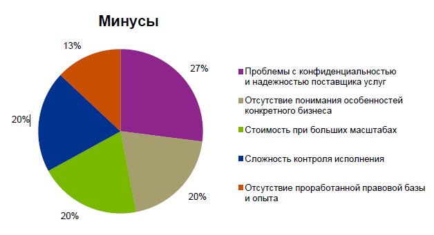 Среди недостатков были отмечены проблемы, связанные с конфиденциальностью обрабатываемой информации и надежностью поставщика услуг, недостатком понимания или желания вникать в особенности конкретного бизнеса, высокой стоимостью при больших объемах услуг, затруднением контроля выполнения поставленных задач в силу отсутствия проработанной правовой базы и опыта передачи части своих обязанностей внешнему исполнителю.