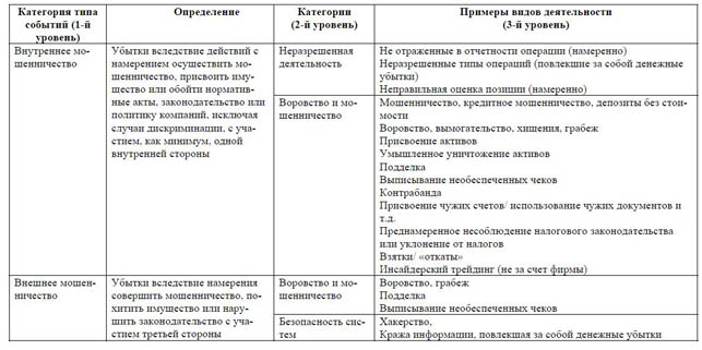 Как уже говорилось, фрод -- это риск операционный. Соглашение Basel II Базельского комитета по банковскому надзору определяет операционный риск как «риск потерь, связанных с неадекватными или неудачными внутренними процессами, системами или человеческими ошибками либо с внешними событиями». Там же была предложена и классификация событий, вызвавших убыток (см. таблицу). На первом уровне этой классификации выделяются типы событий (в частности, внутреннее и внешнее мошенничество), на втором -- события, относящиеся к каждому из типов (например, неразрешенная деятельность, воровство и мошенничество - для внутреннего мошенничества; нарушение безопасности систем и опять же воровство и мошенничество -- для внешнего мошенничества), а на третьем уровне приводятся примеры видов деятельности для каждой из выделенных категорий (операции, намеренно не отраженные в отчетности; неразрешенные операции, повлекшие за собой денежные убытки; намеренно неправильная оценка позиции и т.д.).