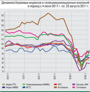 Обыкновенные акции класса «А» компании Yandex N.V. («Яндекс»), обращающиеся на NASDAQ, за полтора месяца подешевели на 12% – до отметки $30,59. Основная причина уменьшения капитализации российского поисковика – резкая коррекция американской биржи NASDAQ, индекс которой снизился почти на 8%; падение американских площадок потянуло за собой бумаги высокотехнологичных компаний. Корпоративные новости «Яндекса» также оставляли желать лучшего. Так, 27 июля компания представила финансовые показатели за I полугодие и II квартал 2011 г., первые после IPO в мае этого года: чистая прибыль поисковика по неаудированным данным в соответствии с US GAAP в первом полугодии составила 1,945 млрд руб. (на 27,6% больше, чем за аналогичный период 2010 г.), выручка увеличилась на 61% – до 8,435 млрд руб. Давление на бумаги «Яндекса» оказали и случившиеся в августе технические проблемы с серверами и с индексацией поисковиком конфиденциальных данных, что повлекло за собой риски перетока рекламодателей к конкуренту – американской Google.