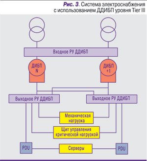 Используя в крупных ЦОДах мощностью более 1–2 МВт дизельные динамические ИБП, можно существенно упростить и удешевить систему электропитания (рис. 3) и перейти от «базового» уровня готовности системы электропитания к отказоустойчивому.