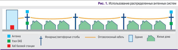 Функции традиционных секторных антенн распределяются между несколькими антеннами, запитанными от оптоволоконных линий, которые протягиваются, как правило, вдоль существующих линий коммунальных сетей (рис. 1). Электропитание на каждый антенный узел подается предприятием коммунального хозяйства через точку разграничения ответственности. Для питания электроники узла требуется около 200 Вт постоянного тока, резервные аккумуляторы постоянного тока обычно не нужны.
