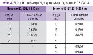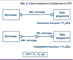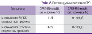 Очевидно, что большие значения CPR говорят о том, что основная часть мощности переносится модами высших порядков (значительное переполнение сердцевины), поскольку на стыке многомодового и одномодового волокон будут зафиксированы большие потери. Данная методика является удобным и доступным способом контроля ввода при проведении измерений затухания в оптическом тракте. Рекомендуемые значения CPR определены, например, в стандарте TIA/EIA-526-14A (для справки они приведены в табл. 2).