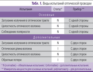Состав и периодичность испытаний оптической проводки указаны в стандарте ISO/IEC 14763-3, который определяет способы подтверждения соответствия параметров сертифицируемой СКС требованиям стандарта ISO/IEC 11801. В общем случае любая оптическая линия должна быть протестирована согласно принятому плану испытаний при помощи измерителя мощности с соответствующим типом источника излучения или рефлектометрическими методами на соответствующей центральной длине волны. Второй метод выступает как дополнительный, и его рекомендуется использовать для идентификации, локализации и поиска способа устранения неисправности в оптической линии.