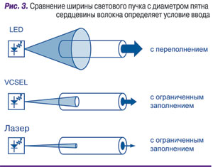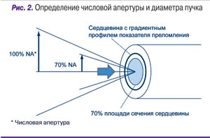 При падении электромагнитной волны на торец волокна не все направляемые моды сердцевины возбуждаются одинаково. Поэтому условия ввода определяют, как и в какой степени будут возбуждены группы мод низшего и высшего порядков. На практике для описания условий ввода используют два параметра: диаметр пятна и числовую апертуру (NA) светового пучка*. Если условия ввода таковы, что диаметр пучка превосходит соответствующее значение диаметра пятна моды сердцевины и (или) значение числовой апертуры, то можно говорить об условии ввода с переполнением сердцевины. В том случае, когда диаметр пучка и (или) числовая апертура равны 70% или менее соответствующих значений для самого волокна, принято говорить об ограниченном условии ввода (рис. 2).