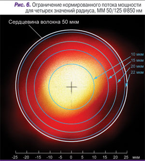 Коэффициент CPR. Второй способ определения условий ввода излучения основан на параметре CPR (coupled-power ratio), который позволяет оценить распределение мощности по сечению сердцевины волокна и, соответственно, между различными группами направляемых мод (рис. 4). Методика измерения детально описана в стандарте IEC 61300-3-31.