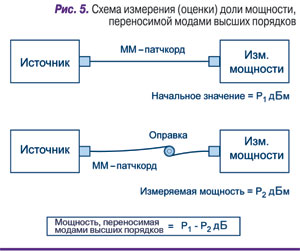 Модовый фильтр. В дополнение к измерению параметра CPR рекомендуется провести измерения, используя модовый фильтр – оправку с несколькими витками измерительного патчкорда. Очевидно, что слабосвязанные направляемые моды высших порядков становятся излучаемыми, как только возникает многократный макроизгиб волокна и нарушается условие полного внутреннего отражения на границе раздела сердцевина – оболочка. Таким образом, проведение последовательных измерений без модового фильтра и с ним позволяет оценить долю мощности, которая переносится слабосвязанными модами (рис. 5).