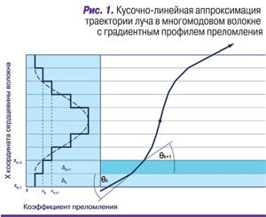 На практике в большинстве случаев в составе оптической СКС используются многомодовые волокна различных категорий с градиентным профилем показателя преломления. Анализ распространения света в сердцевине волокна подразумевает сложный математический аппарат и в большинстве случаев основан на приближенных решениях волновых уравнений, не всегда имеющих аналитические решения в явном виде. Чтобы упростить обсуждение, заменим реальные пространственные конфигурации полей лучевыми траекториями и введем следующие допущения: