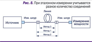 На рис. 8 представлена условная схема измерения потерь в линии. Метод 1 представляет собой классический способ измерения вносимых потерь в соединении и не учитывает потери на дальнем конце стационарной линии. Эта методика наиболее интуитивна, она широко применяется при измерении потерь в пассивных оптических компонентах, например потерь в оптическом разъемном соединении при производстве оптических шнуров и пигтейлов. Таким образом, результаты измерений будут оптимистичными, в результаты придется вносить поправки, добавляя некие «средние, типовые» потери в соединении на дальнем конце линии.