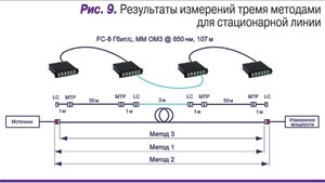 Метод трех перемычек в данном случае показывает суммарные потери в линии меньше допустимых потерь, определяемых стандартом для параметров физического уровня 8 Гбит/с Fiber Channel. Однако необходимо отметить, что исключение потерь в разъемных соединениях LC на обоих концах линии эквивалентно присутствию «идеальных» соединений без потерь (потери 0 дБ), что с практической точки зрения трудновыполнимо.