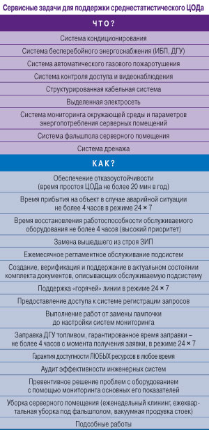 Зачастую собственная служба эксплуатации компании – владельца ЦОДа не имеет достаточной квалификации для выполнения даже половины требуемых работ. Обеспечение функционирования среднестатистического центра обработки данных складывается из обширного перечня задач (см. таблицу). Не говоря уже о складе запасных частей, которые нужно закупать и всегда иметь под рукой для того, чтобы можно было гарантировать отказоустойчивость ЦОДа и непрерывность предоставления сервисов.