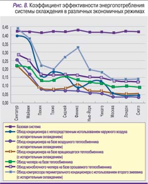 Полезно также сравнить энергопотребление в экономичном режиме с традиционной системой из чиллера и градирни, используемой в большинстве ЦОДов мощностью от 1 МВт. Эта базовая система предполагает применение периметрального охлаждения без разделения разнотемпературных воздушных потоков и без экономичных режимов, с температурой чиллерной воды 7,2°C2 и вентиляторами постоянной производительности в фанкойлах. Сравнение различных экономичных режимов с этим базовым уровнем по коэффициенту эффективности энергопотребления системы охлаждения (CLF)3 проводилось для 11 городов (рис. 8), где имеется значительное количество ЦОДов. CLF представляет собой составляющую PUE, относящуюся к системе охлаждения ЦОДа.