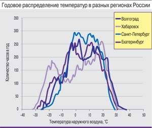 Различия в климатических параметрах для регионов России хорошо иллюстрируют кривые годового распределения температур для четырех городов (см. рисунок). Пики на кривых соответствуют наиболее распространенным температурам за год. Например, для Северо-Запада характерны температуры в диапазоне от –2 до +12°С (см. график для Санкт-Петербурга), на Дальнем Востоке этот диапазон смещен к значениям от +7 до +20°С (график для Хабаровска). Таким образом, территория России включает различные климатические зоны, и применять один и тот же коэффициент ESEER для всех районов страны будет некорректно.