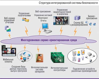 Самый увлекательный момент в создании комплексной системы безопасности любого объекта – это сведение всех подсистем в целостный интегрированный организм (см. рисунок), отдельные «органы» которого должны чутко реагировать на изменения, происходящие в любой части целостной системы. Интеграция подразумевает также наличие единого интерфейса для мониторинга и настройки всех подсистем ТСБ. Продолжая аналогию с живым организмом, можно сравнить рефлексы, на уровне которых все живое борется с внешними и внутренними неблагоприятными факторами, с пользовательскими сценариями, которые мы можем задать в рамках интегрированной системы безопасности. Эти сценарии определят способы реагирования комплексной системы на различные события и станут своего рода ее рефлексами.