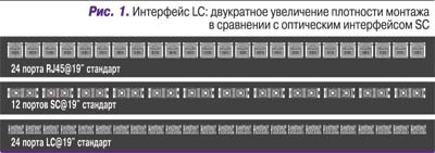 Среди главных преимуществ оптического соединителя LC – возможность разместить дуплексный оптический порт на той же площади, что и медный порт RJ45 (рис. 1), к тому же в соединителе LC используется схожий механизм фиксации защелкой.