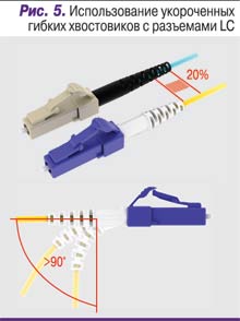 Один из альтернативных подходов, повышающих удобство обслуживания разъемных соединений LC в условиях высокой плотности монтажа, – использование укороченных гибких хвостовиков (рис. 5). Производители, предлагающие такие решения, сообщают о том, что реализуется удобный доступ к оптическим портам и что возможна безопасная выкладка коммутационных шнуров даже в условиях ограниченного пространства между плоскостью установки оборудования и дверью шкафа.