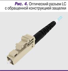 Среди интересных, нестандартных решений, имеющихся на рынке, следует отметить конструктивное исполнение разъема LC с так называемой обращенной защелкой (рис. 4). Сохраняя полную совместимость с розетками стандартного исполнения, такая конструкция разъема обеспечивает хороший доступ к защелкам за счет увеличенной площадки, снижает вероятность перепутывания оптических шнуров из-за того, что кабель оптического шнура зацепится за защелку. Кроме того, в дуплексном исполнении благодаря конструкции используемой клипсы прикладываемое усилие равномерно распределяется на обе защелки.