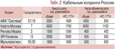 В России, по данным АКТР, услуги КТВ предлагают около 800 операторов с общим числом абонентов 13,5 млн. Более половины из них приходится на шесть крупнейших холдингов: «Нафта Москва», АФК «Система»/СММ, «Ренова Медиа», «ЭР-Телеком», «Мультирегион», «Связьинвест». А из этих более чем 7 млн около 3,5 млн могут, в принципе, пользоваться услугами ШПД, поскольку их обслуживают сети FTTH и HFC (табл. 2). Кабельные операторы не очень охотно раскрывают данные о своих интернет-подписчиках, но, например, в конце октября этого года холдинг «ЭР-Телеком» объявил о подключении 200-тысячного абонента ШПД, а в планах до конца 2007 г. подключить еще 50 тыс. Получается, что «классический» оператор КТВ встал в первый ряд российских интернет-провайдеров. Да и «Мультирегион» признает, что из 600 тыс. его абонентов КТВ около трети - подписчики ШПД.