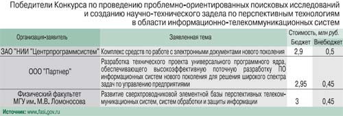 Минобрнауки в лице Федерального агентства по науке и инновациям определяет эти направления, но очень уж не навязчиво. Оно реализует ФЦП «Исследования и разработки по приоритетным направлениям развития научно-технологического комплекса России на 2007-2012 гг.», в частности по приоритетному направлению «Информационно-телекоммуникационные системы» (1я очередь). Два десятка организаций (в таблице приведена первая тройка), победившие в феврале нынешнего года в конкурсе на проведение проблемно ориентированных поисковых исследований и создание научно-технического задела по перспективным технологиям в области инфокоммуникационных систем, получили на исследовательские нужды в среднем по 3 млн руб. Отметим, что ФЦП по нанотехнологиям и ФЦП по электронной компонентной базе и электронике - это независимые от данной ФЦП направления.