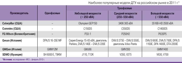 Рост рынка ДГУ оказался неоднородным. Сегмент малой мощности и однофазных решений вырос в денежном выражении почти на 50%, средней – на 15–20%, а поставки наиболее «тяжелых» систем увеличились на 7–10%. Наибольшим спросом во всех сегментах пользовались разработки зарубежных производителей, таких как Aksa, Caterpillar, Cummins, FG Wilson, Gesan, SDMO, хотя все чаще встречалась и продукция российских компаний. При этом у каждого вендора сложился свой набор моделей, которые были популярны в разных сегментах (см. таблицу).
