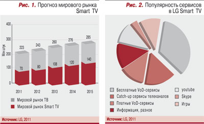 Формирование нового рынка сбыта контента, привлечение новых покупателей, конкуренция – эти три фактора будут, вероятно, в ближайшие годы главными драйверами производства смарт-телевизоров, доля которых, по данным LG, в 2011 г. составляла около 35% от всех проданных телевизоров, а к 2015 г. вырастет до 50% (рис. 1).