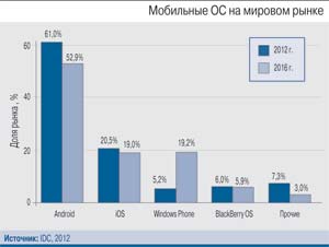 «Смартфонную волну» поднимают мобильные операционные системы, конкурирующие за популярность на массовом рынке. Безусловным фаворитом практически с момента своего появления остается Google Android, сразу обогнавшая по доле рынка Apple iOS; обладатели второго места, третьего и так далее меняются год от года. В 2011 г. IDC так оценивала расстановку сил среди мобильных платформ: Google Android – 40%, Nokia Symbian – 21%, Apple iOS – 18%, RIM BlackBerry – 14%, прочие – 7%. В нынешнем году 2-е место обещано iOS (см. рисунок), а Symbian уже причислена к «прочим», и к 2014 г., по прогнозу IDC, эта платформа уйдет с рынка. Дело в том, что Nokia, заключившая в феврале 2011 г. соглашение о партнерстве с Microsoft, переводит практически все свои смартфоны на ОС Windows Phone – и этой платформе аналитики предсказывают высокие темпы роста. Ожидается, что к 2016 г. она может выйти на второе место (многие эксперты считают данный прогноз спорным, но в «большую тройку» мобильных платформ Windows Phone определенно готовы впустить).