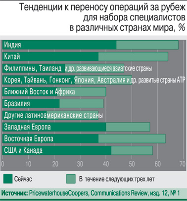 Результаты опроса показывают, что многие компании начинают испытывать сложности поиска квалифицированных специалистов на развитых рынках и удержания уже набранных ими сотрудников. И, естественно, они приходят к необходимости роста своих возможностей за счет управления мировыми резервами специалистов.Потенциальный источник для найма талантливых специалистов – страны с развивающейся экономикой. Глобальная стратегия привлечения сторонних специалистов обеспечивает и доступ к новым потребительским рынкам. Проблема лишь в том, чтобы научиться такие источники эффективно использовать. По мере того как телекоммуникационные компании решают эту задачу, у них возникает необходимость в одновременной оценке и своего стремления перенести часть операций за рубеж, и стратегии управления персоналом на развивающихся рынках. Но то и другое оценить довольно сложно.