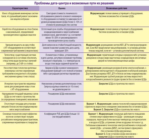 Для некоторых качественных характеристик, относящихся к разным типам ЦОДов, возможен перевод в количественные аналоги, и мы предлагаем свое видение такого перевода. Но существуют и параметры, которые не стоит или невозможно переводить в цифры; для них мы даем только качественную оценку. Далее, рассматривая в отдельности каждый из сформулированных выше признаков, определяющих основные проблемы дата-центра, мы попытались выбрать наиболее вероятные в данной ситуации и подходящие действия, сведя все эти данные в таблицу.