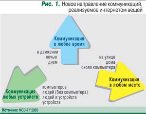 Концепция сетей NGN предполагала возможность коммуникаций людей (непосредственно или через компьютеры) в любое время и в любой точке пространства. Концепция интернета вещей включает еще одно направление – коммуникация любых устройств, или вещей (рис. 1).