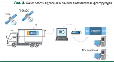 Схема 4 – если нет инфраструктуры. Применяется в случае отсутствия в районе работы техники как покрытия сотовых сетей, так и любых других каналов передачи данных (рис. 3).