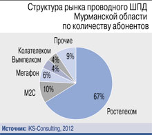 Очевидно, рынок уже насыщен, ведь по проникновению проводного ШПД Мурманская область также впереди многих – по данным на конец 2012 г. к высокоскоростному интернету было подключено 52% домохозяйств, что превышает среднероссийский уровень на 6 п.п.