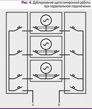 Чтобы реализовать Tier III или IV при параллельном подключении, щит синхронной работы, разумеется, также нужно дублировать, как показано на рис. 4. Сложнее всего в этом случае разобраться с сигнальными цепями, поскольку и их потребуется резервировать.