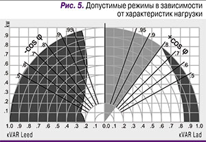 На рис. 5 показаны типичные допустимые режимы в зависимости от cos нагрузки. Центральная область, сектор от 1 до 0,8 – это оптимальный режим. Крайние темные области – зона срабатывания защиты. Очевидно, что достаточно небольшой емкостной нагрузки, чтобы защита сработала. В остальной части диаграммы генератор способен работать, но это не оптимальный вариант из-за роста потерь и перегрева.