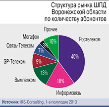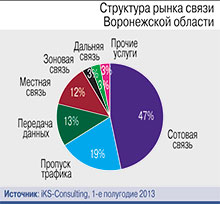 Воронежский телеком-рынок – крупнейший в ЦФО после Москвы и Московской области. По объему доходов от услуг связи в первом полугодии 2013 г. (8,25 млрд руб.) область замыкает топ-20 регионов РФ. Прирост телеком-выручки (6%) за этот период превышает средний по России показатель практически вдвое.