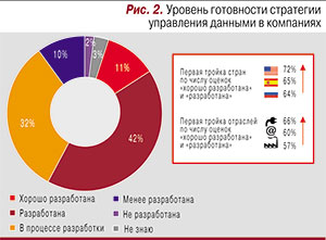 Большинство компаний в разных странах, как показывают данные нашего исследования, считают, что у них уже готова стратегия управления данными. В их числе немало и компаний из России, где 64% опрошенных оценили такую стратегию как «хорошо разработанную» (рис. 2). Этот показатель всего лишь демонстрирует уверенность предприятий в существующей стратегии, что, возможно, и объясняет пока небольшое количество проектов.