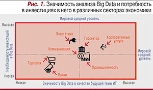 Достаточно непростая картина наблюдается повсеместно в отдельных отраслях (рис. 1). Неповоротливый государственный сектор, поставщики энергии и материальных ресурсов показывают высокую заинтересованность в Big Data, тогда как компании из банковского и страхового секторов, имеющие огромные базы данных, как выясняется, достаточно слабо осознают необходимость глобальных перемен в способах их обработки. Впрочем, это можно объяснить и тем, что банковский сектор уже имеет налаженную систему работы с клиентами, которая функционирует долгие годы и пока устраивает первых лиц.