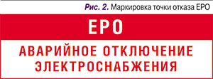Точки отказа. Неочевидный и в тоже время весьма важный объект маркирования в ЦОДе. К этой категории объектов относятся автоматические выключатели или рубильники, отключение которых может привести к нештатной ситуации, в том числе кнопки аварийного отключения электроснабжения (EPO, рис. 2), а также демаркационные точки подключения к внешним сетям передачи данных. При обозначении таких точек полезно дополнять маркировку кратким описанием нештатной ситуации и контактными данными ответственного лица.