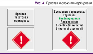 Структура элементов маркировки может быть достаточно разнообразной и разрабатываться под конкретные цели и задачи. Маркировка может быть простая, сложная, комбинированная или, например, рейтинговая. При создании маркировки можно управлять цветами, шрифтами, знаками, элементами, позволяющими расставлять акценты. Очевидно, что следует стремиться к гармоничности и эстетичности маркировки, скажем, цвет ее элементов должен сочетаться с цветом изделия и быть контрастным по отношению к фону. Элементы могут быть простыми, выполненными в виде кода, текста, пиктограммы, т.е. рисунка или символа (рис. 4, слева). В полях составной маркировки (также называемой групповой, комбинированной и расширенной) может быть дано описание, технические характеристики, вспомогательные диаграммы, схемы, рисунки (рис. 4, справа). Для лучшей читаемости может быть введена система акцентов и важностей, реализуемая через цвета, размеры, шрифты, восклицательные знаки, дублирование и т.д.