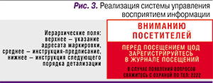 Расположение и исполнение маркировочных элементов должно поддерживать иерархическую систему управления восприятием (рис. 3). При этом важно учитывать психологические особенности восприятия информации человеком. Так, обозначение ряда шкафов должно визуально находиться и восприниматься быстрее, чем обозначение шкафа в этом ряду, так как это разные уровни иерархии объектов. Применение цветов, которые ассоциируются с опасностью (красный, оранжевый) должно быть оправданным: ими помечаются действительно важные или опасные объекты или с ними связываются действия, которые обязательно должны быть совершены. При возможности нанесения символа вместо надписи предпочтение следует отдавать символу как более доходчивому исполнению элемента маркировки.