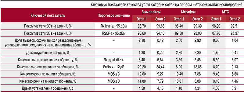 Первые измерения дали общую картину проблем, на основании которой был разработан план действий совместно с операторами и Роскомнадзором. Где-то были введены новые базовые станции (всего большая тройка установила 46 дополнительных БС), где-то перенастроено существующее оборудование. Контрольные измерения должны были показать, какой эффект дали принятые меры. В целом по всем показателям было зафиксировано улучшение примерно на 30%. Показатели качества сервисов, которые имеют социальную значимость и наиболее востребованы гражданами (голосовые вызовы и SMS), все три оператора, участвовавшие в проекте, подняли до мирового уровня (см. таблицу и рисунок).