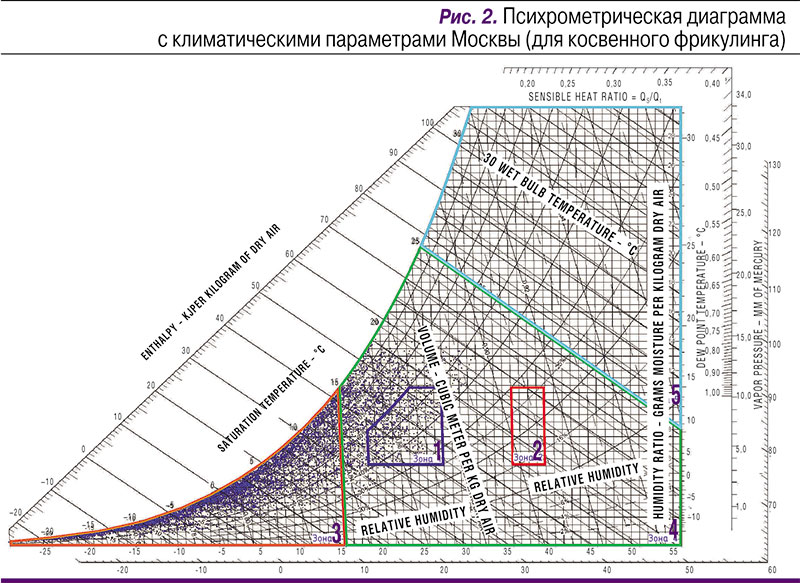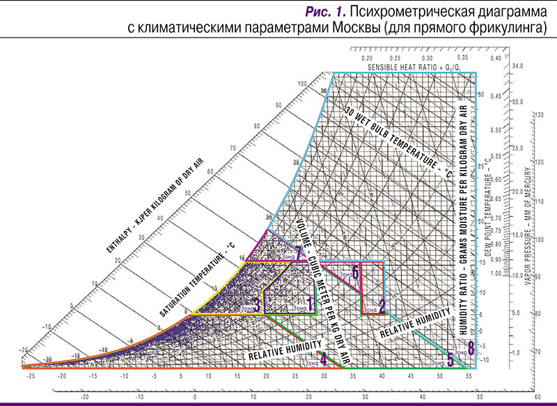 В течение года система прямого фрикулинга может работать в разных режимах в зависимости от зон, которым соответствуют параметры наружного воздуха в тех или иных климатических условиях (рис. 1).