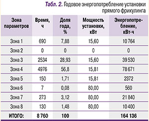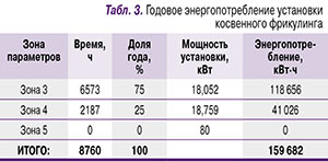 Как видно из таблицы, общая номинальная мощность системы косвенного фрикулинга действительно выше мощности системы прямого фрикулинга. Но это только номинальные значения, которые отражают работу систем в пиковых условиях. На самом деле потребляемые мощности сильно зависят от климатических условий и режимов работы. Используя рис. 1 и 2, на которых, помимо рабочих зон, отражены параметры воздуха в Московском регионе за 2012 г., а также данные по количеству часов работы в каждой зоне, получим общее потребление наших гипотетических установок за 2012 г.