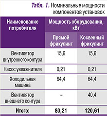 Теперь, когда мы установили режимы работы каждой из установок, определим, сколько они будут потреблять электроэнергии при производительности 50 000 м3/ч (240 кВт). В системе прямого фрикулинга главными потребителями являются вентилятор, насос увлажнителя и холодильная машина. В системе косвенного фрикулинга потребителей несколько больше: вентиляторы внешнего и внутреннего контуров, насос увлажнителя и холодильная машина.